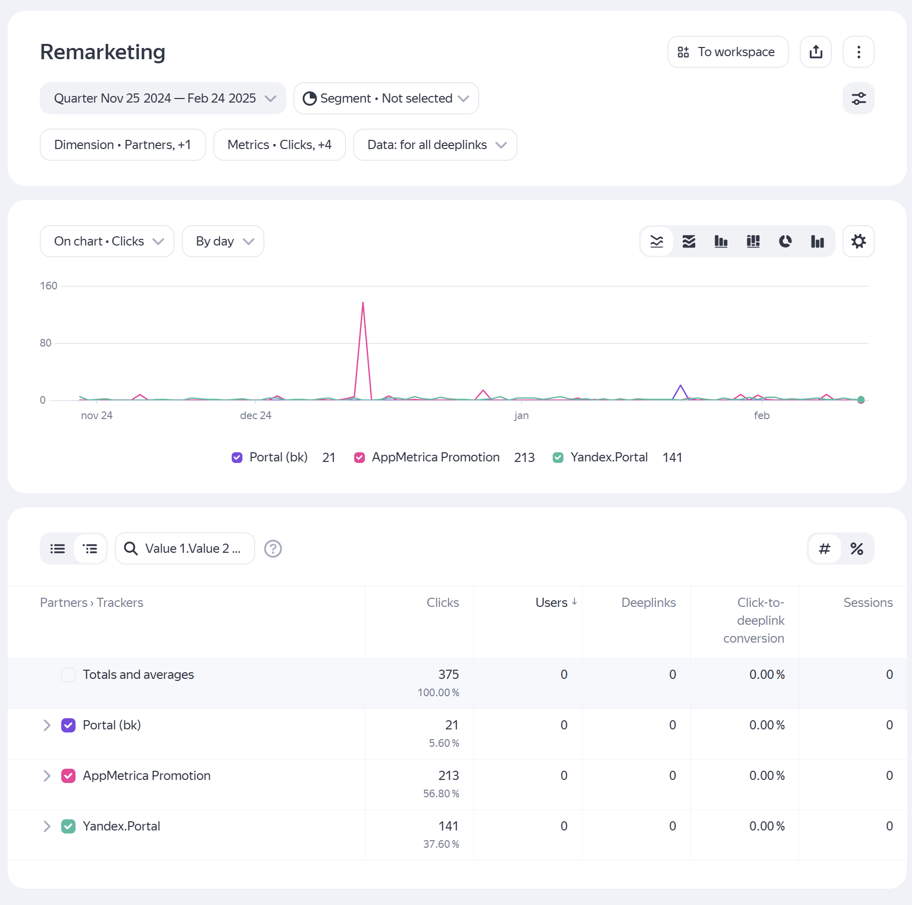 - Users. The number of users that followed the tracking link or re-engagement deeplink.