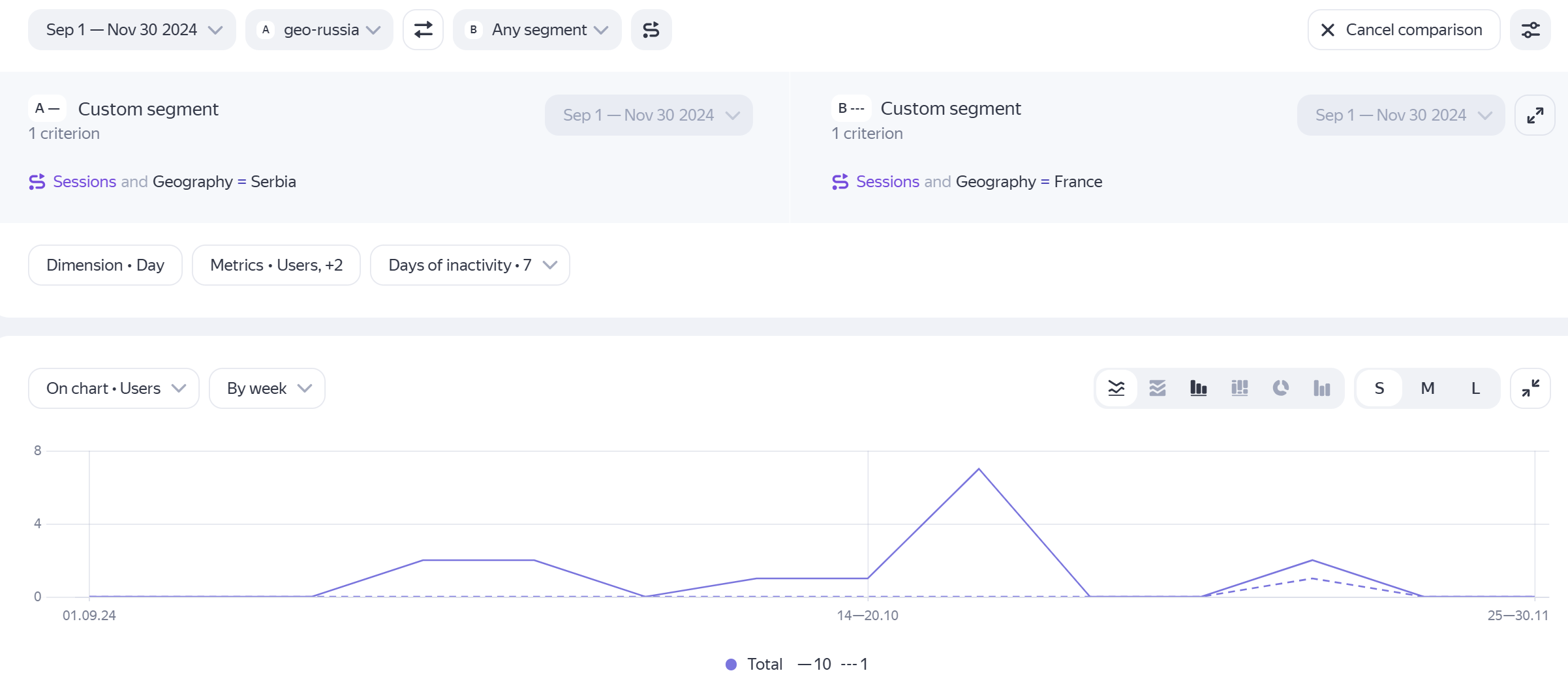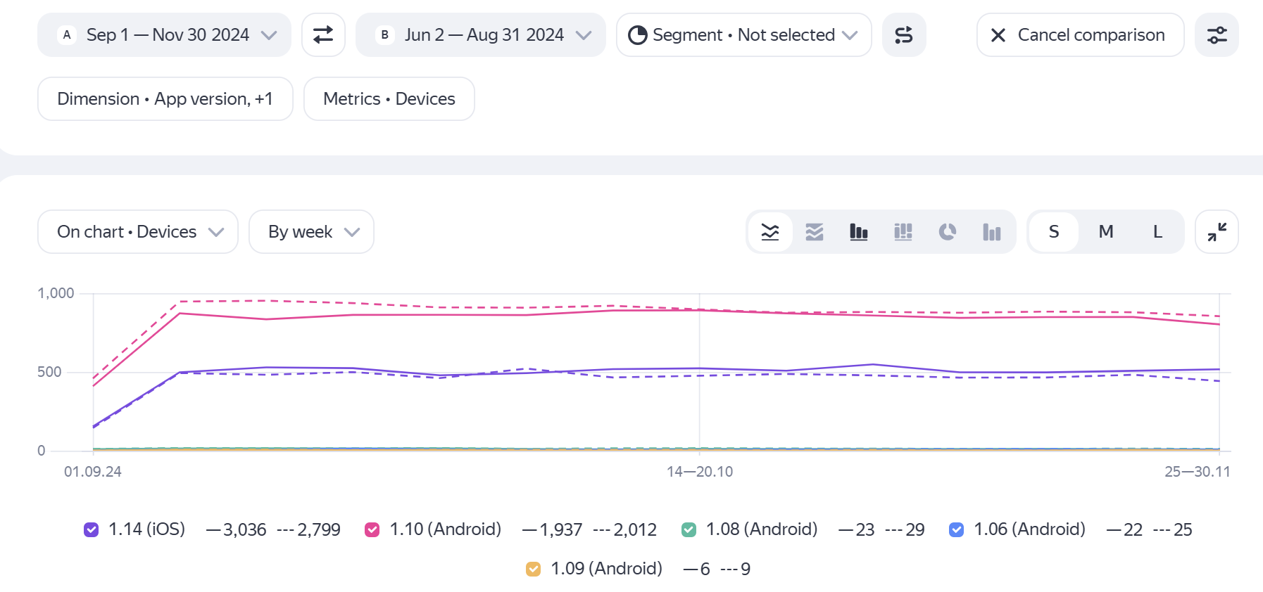 To compare the selected period with the previous period of the same length, click Comparison → With previous period. Charts for the first time period are displayed with solid lines, and for the second — with dashed lines.