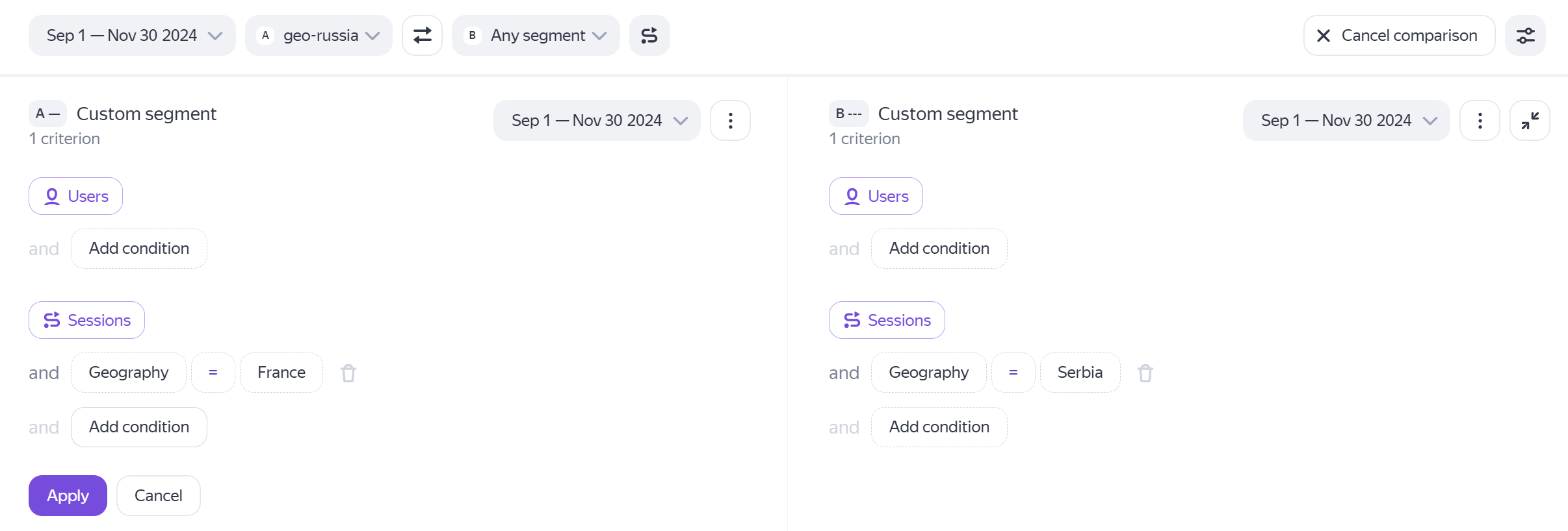Set the second segment: click Comparison → With existing or new segment and select one of the existing segments or create a new one.