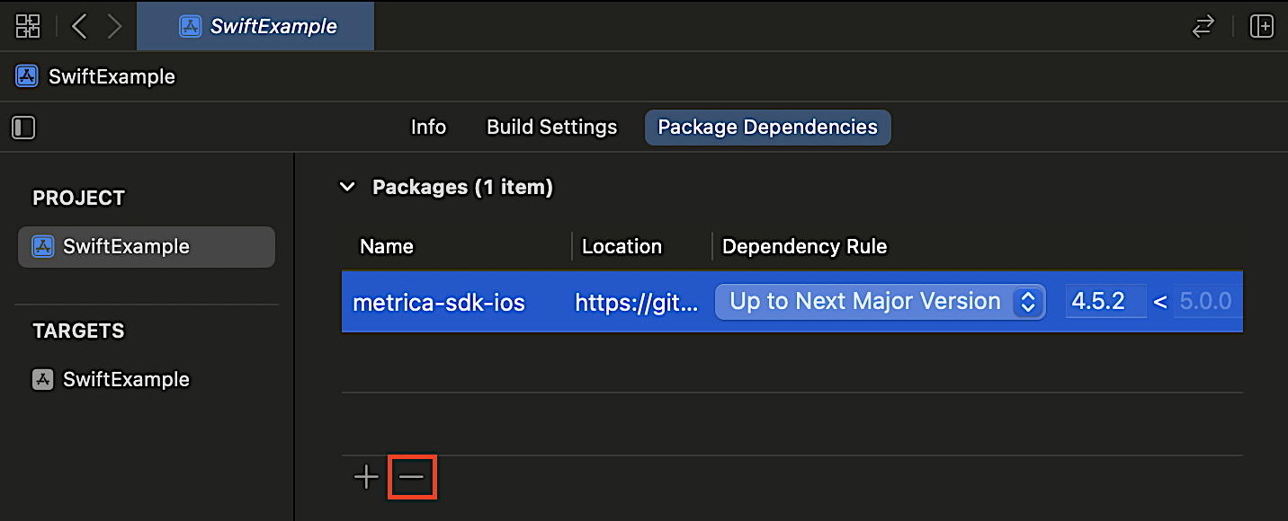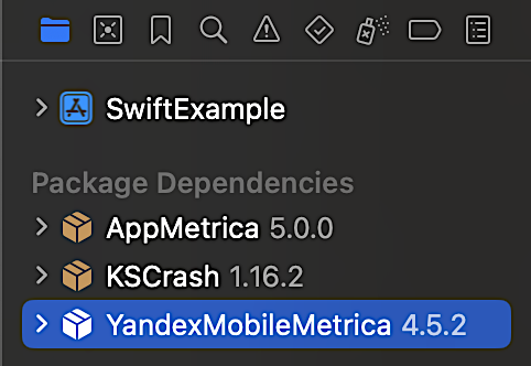 .packagedependency withYandexMobileMetricafrom the filePackage.swiftin your project together with all references to the dependencies in thetargets:section within your project. -