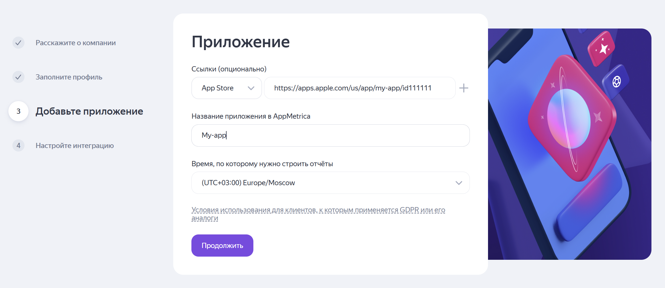 Чтобы зарегистрироваться в AppMetrica и создать личный кабинет, перейдите по ссылке и заполните информацию.