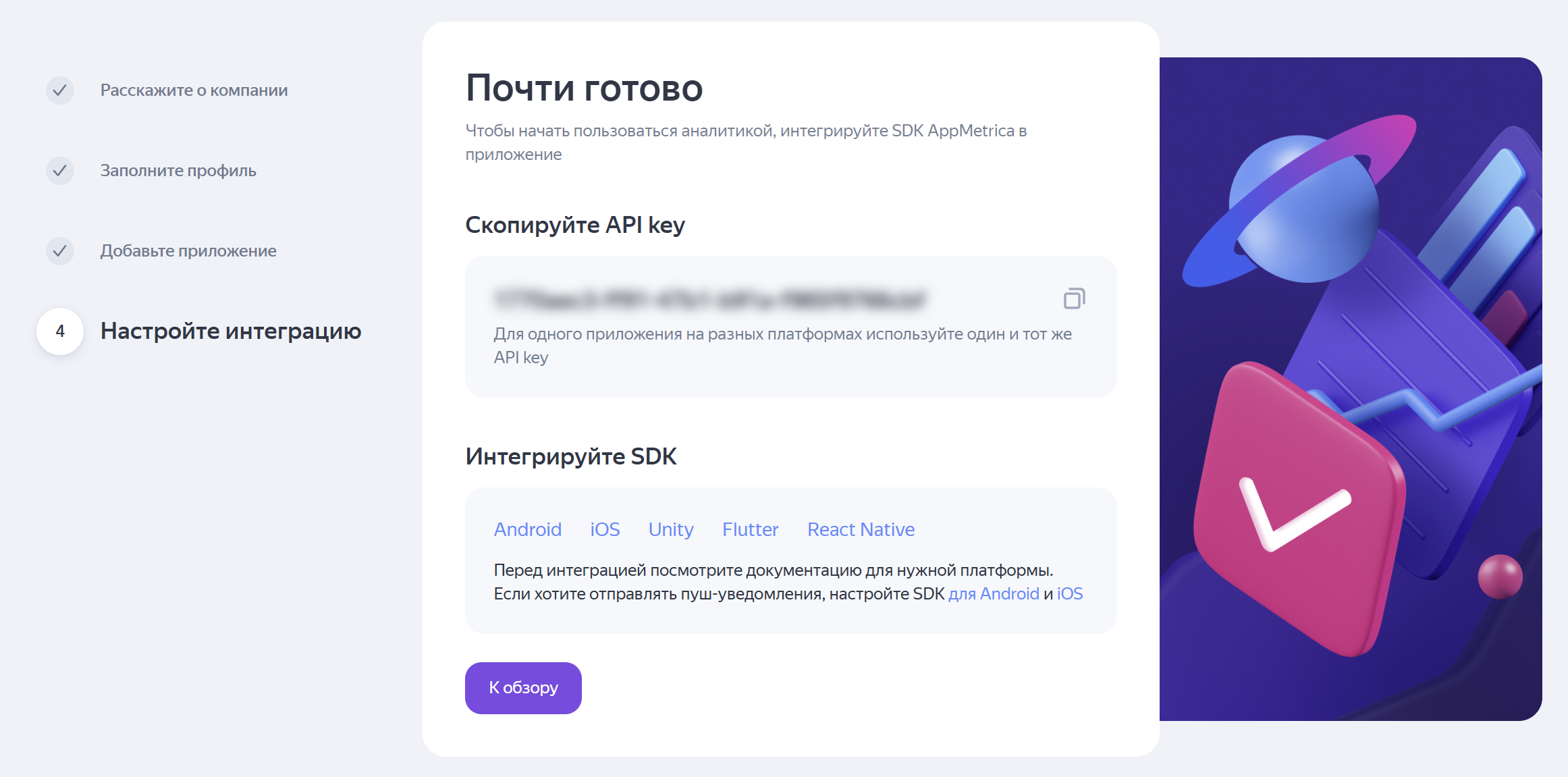 Настройте интеграцию: скопируйте API key для интеграции SDK в приложение. Если вы забыли скопировать API key, вы всегда сможете найти его в кабинете, в разделе Настройки → Основное.