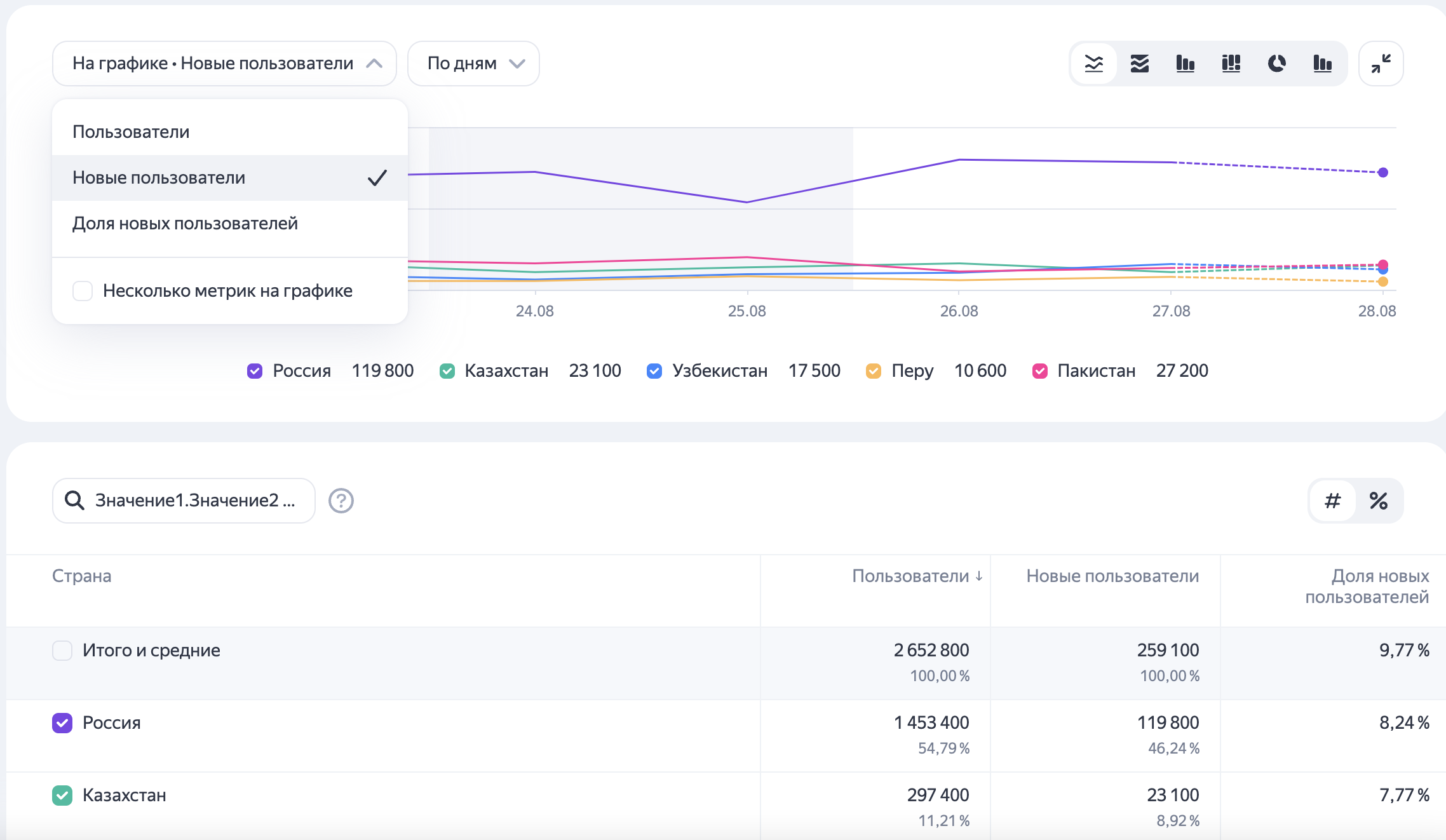 Отчет содержит наглядный график с выбором метрик. Можно выбрать несколько метрик одновременно, если они имеют одинаковые единицы измерения. Если метрика в списке недоступна (название метрики написано серым цветом), значит она имеет другую единицу измерения.