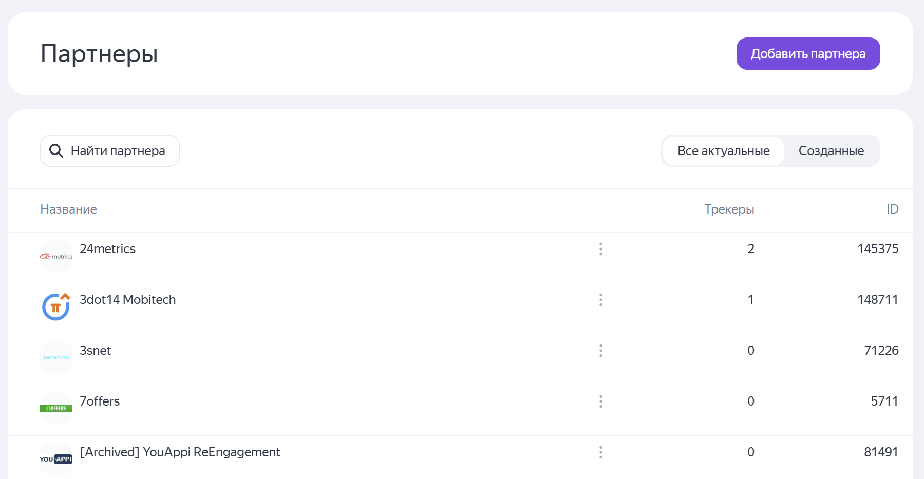 В AppMetrica список партнеров доступен в разделе Трекинг → Партнеры. По умолчанию в списке отображаются и общие партнеры AppMetrica, и собственные партнеры, которых добавили вы или ваши коллеги. Чтобы посмотреть только собственных партнеров, включите опцию Созданные. Чтобы найти конкретного партнера, воспользуйтесь строкой поиска.