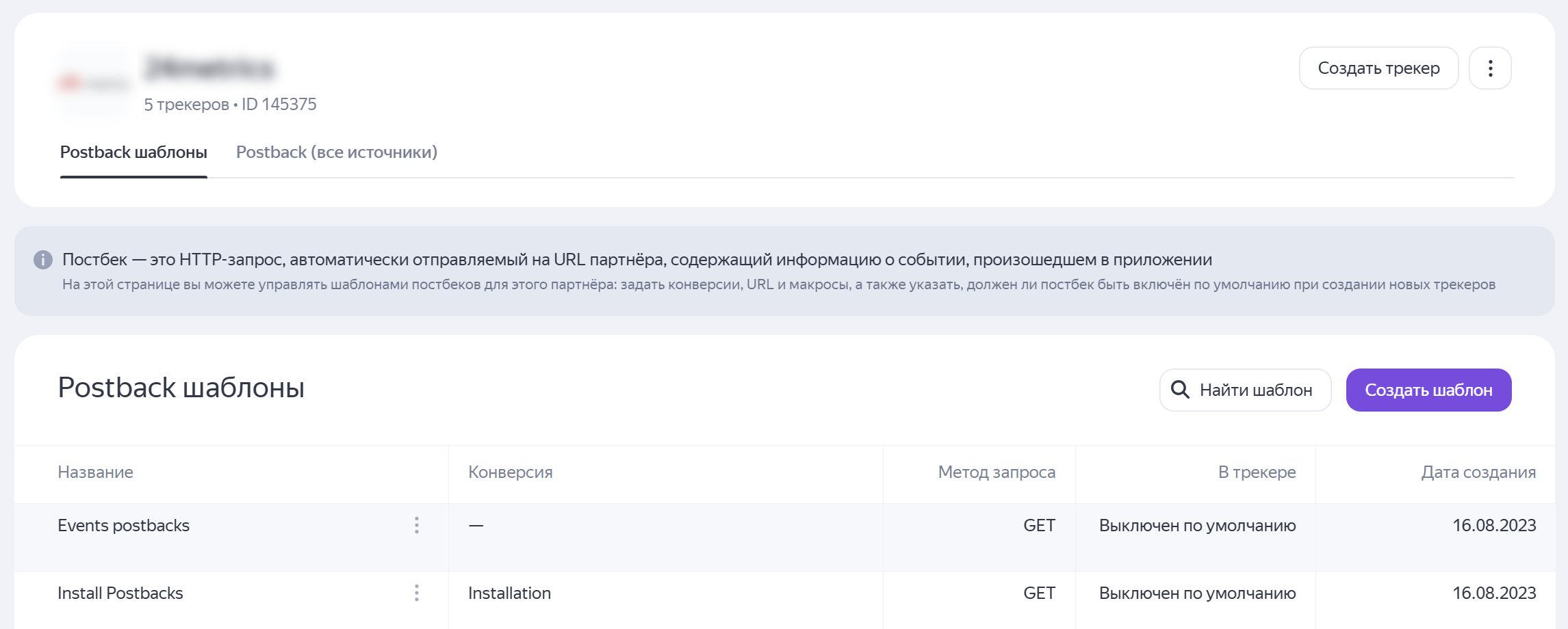Если отметить опцию Добавлять по умолчанию в новые трекеры, постбек будет автоматически активироваться для всех новых трекеров с этим партнером. При создании или редактировании трекера постбек можно будет отключить.